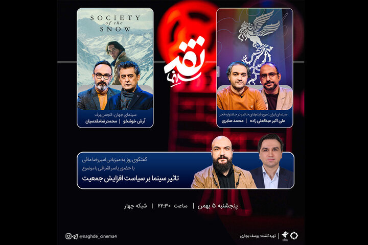 فصل چهارم برنامه تلویزیونی «نقد سینما» که با مشارکت سازمان سینمایی سوره تهیه و تولید می‌شود، هرهفته پنجشنبه‌ها ساعت ۲۲:۳۰ از شبکه چهار سیما به صورت زنده روی آنتن می‌رود. امیدوارم براتون خبر مرور فیلم‌های حاضر در جشنواره فجر ۴۲ در «نقد سینما» براتون مفید بوده باشه.